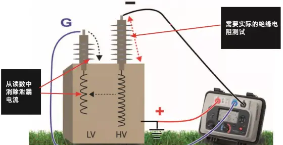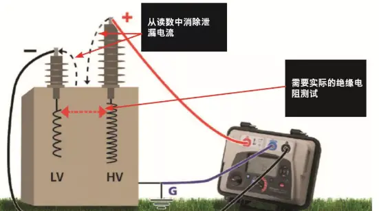上圖:使用屏蔽接口在沒(méi)有高壓和低壓繞組之間的泄漏電流的影響之下,對(duì)高壓繞組進(jìn)行測(cè)試。