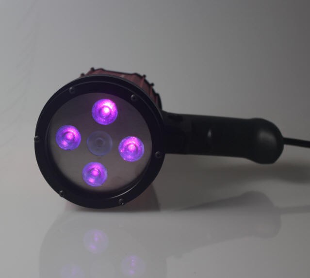 4顆紫外線led,1顆白光led,散光型,透明濾色片,24v電源適配器供電,38cm處紫外線中心強(qiáng)度為4000uw/cm2(適用于航空業(yè)) |