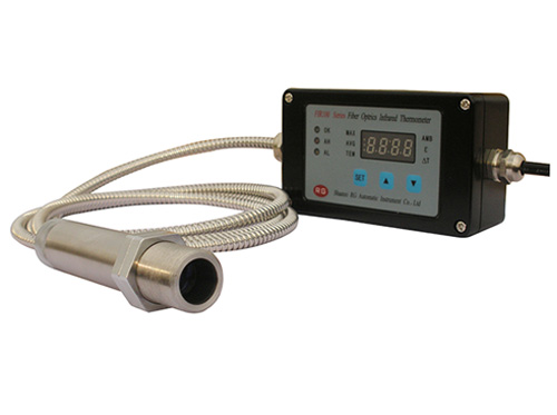 FIR系列光纖紅外測(cè)溫儀的測(cè)溫范圍為300℃~3000℃(分段實(shí)現(xiàn)),固定焦距的精密光學(xué)探頭包括不銹鋼圓柱形外殼和透鏡,其可承受的環(huán)境溫度高達(dá)200℃,光學(xué)探頭可安裝空氣吹掃器以防止透鏡被污染。柔性光纜由不銹鋼金屬套所保護(hù),可使光纜較小的半徑彎曲以便其穿過(guò)狹小的空間,對(duì)無(wú)法直接觀察的目標(biāo)(容器或管道內(nèi)壁處)進(jìn)行溫度測(cè)量